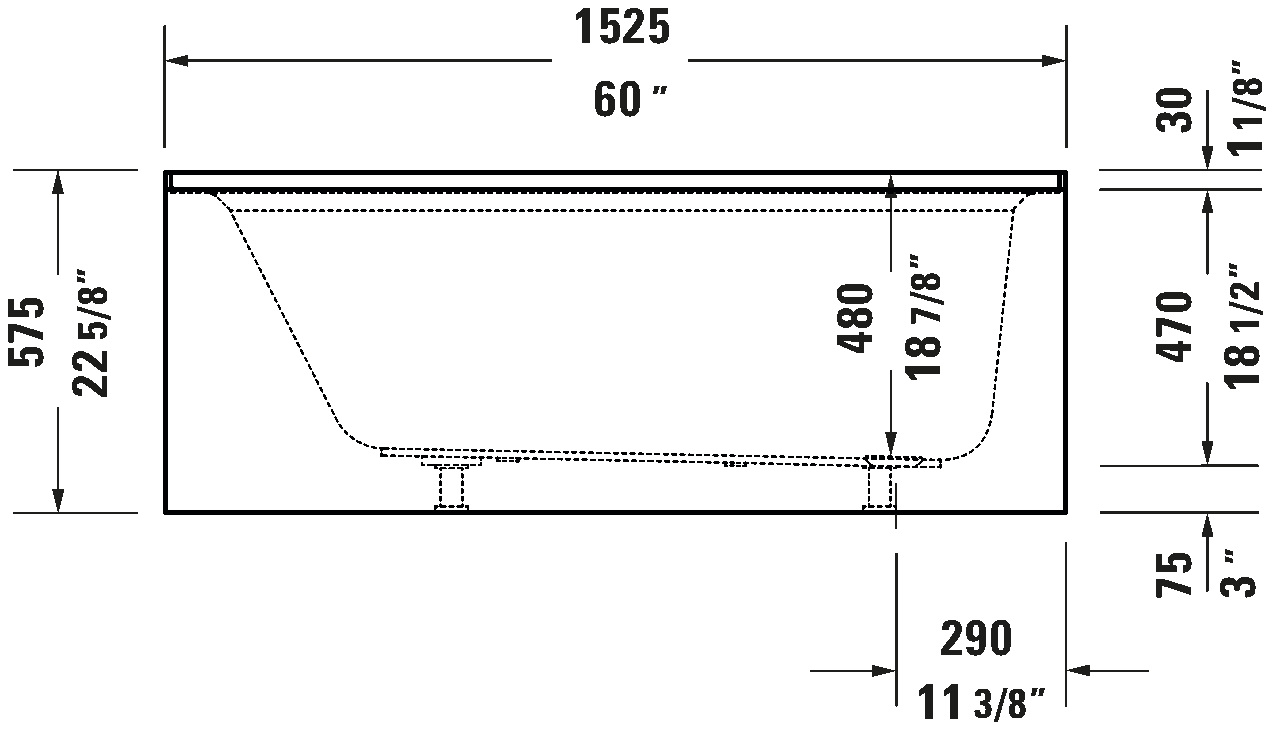 Rectangular, Installation Type: Alcove, Integrated acrylic panel front, White, Material: Sanitary acrylic, Number of backrests: 1 Left, Includes support frame, Overflow: Yes, Drain orientation: Above the ground, Right, Overflow position: Foot end, Capacity gal: 34 gal, Internal Depth: 18 7/8 ", cUPC listed: Yes