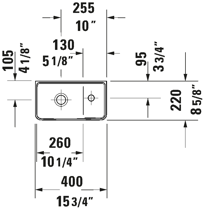 D-shaped, Includes faucet deck: Yes, Overflow: No, Underside glazed, 15 3/4 ", Internal dimensions: 10 1/4 "